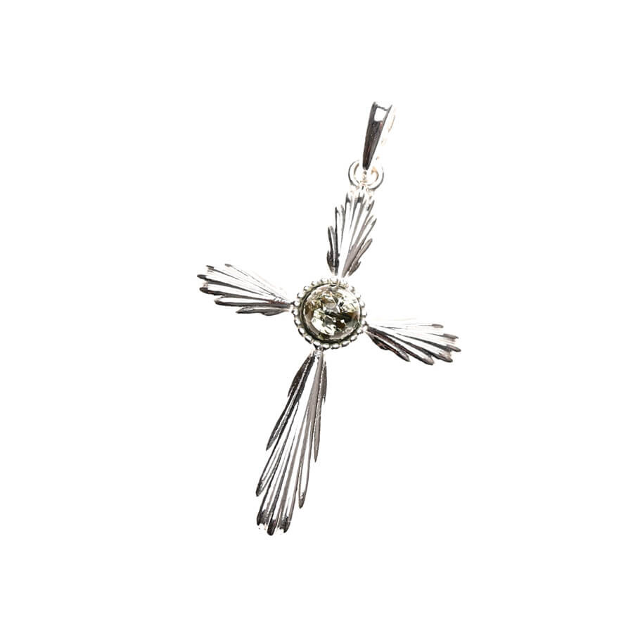 Spojenie duchovnej sily a prírodnej elegancie. Tento jedinečný prívesok v tvare krížika je zdobený pravým baltským jantárom v zelenom odtieni, kameňom so storočnou históriou a výnimočnou krásou.