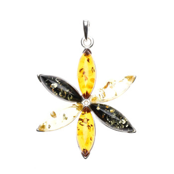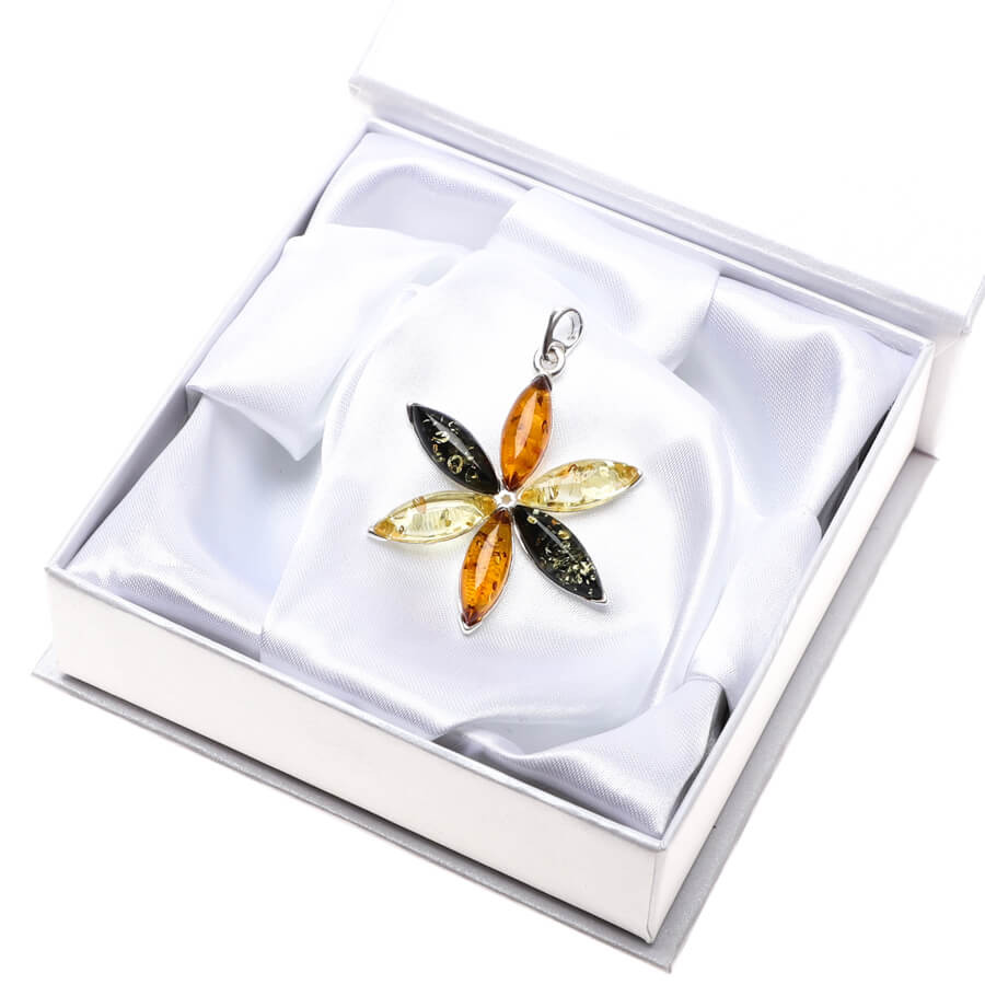 Zahaľte sa do jantárovej krásy. Baltické zlato v podobe tohoto elegantného prívesku KVETINA dokonale rozjasní vašu jedinečnosť. Strieborný prívesok ozdobený koňakovým, zeleným a vzácnym žltým jantárom prináša pôvab a nehu. Výrazný prívesok zdobí jantár s neopakovateľnou priezračnou štruktúrou v jasnom prevedení. Graciózny prívesok KVETINA inšpirovaný krásou prírody úžasne zvýrazní jedinečnosť každej ženy.